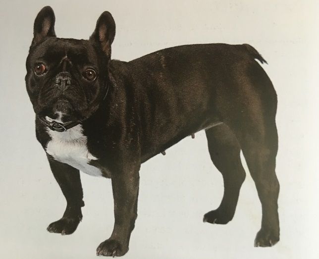 Manto barcino, pio o cervato, con pelo cortó y liso. Ojos oscuros y redondos, caídos y separados entre sí. Orejas de murciélago, implantadas altas y erectas. Cola sin amputar, muy corta de nacimiento, recta o retorcida, pero jamás vuelta sobre el lomo. Cuerpo corto y musculoso, ancho y fuerte a la altura de la paletilla, que se va estrechando progresivamente hacia las ijadas. Patas traseras fuertes y ligeramente más largas que las delanteras.