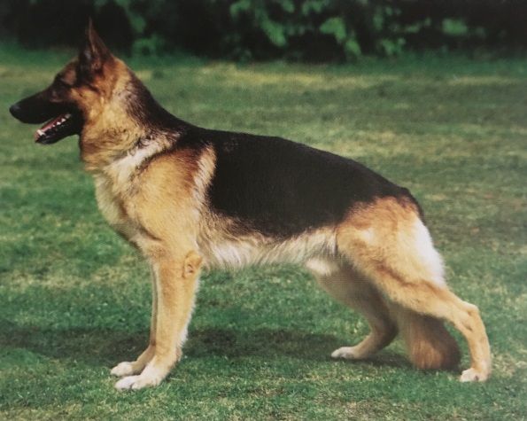 Pelaje corto y tupido, con abundante entrepelo; fuego, dorado o gris claro con fondo negro o con una gran mancha negra en forma de silla de montar. También hay ejemplares negros o grises con manchas claras o marrones. Ojos almendrados. Orejas anchas por la base, implantadas altas y erectas. Cola muy poblada, que traza una suave curva en forma de sable. Pies: dedos redondeados, arqueados y apretados; almohadillas resistentes y gruesas. Pecho profundo y lomo levemente inclinado hacia la cola.