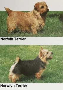 El rasgo que diferencia ambas razas son las orejas, erectas y puntiagudas en el Terrier de Norwich y colgantes en el de Norfolk. Reconocidas como razas independientes por el Kennel Club Británico desde 1964.